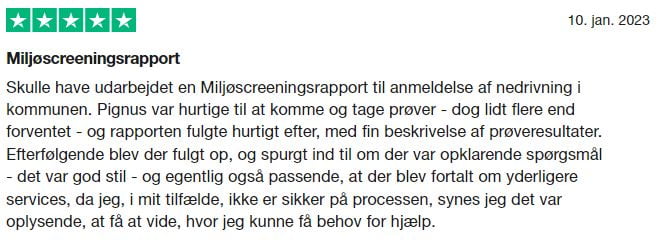 Fra vi kommer og tager prøverne, til du har miljøscreeningen i hånden går der maks. 14 dage. Vi anbefaler at få udarbejdet en rapport inden du kontakter et nedrivningsfirma. Når du har rapporten, kan du få en samlet pris fra nedrivningsfirmaer for afskaffelse af affald og nedrivning
